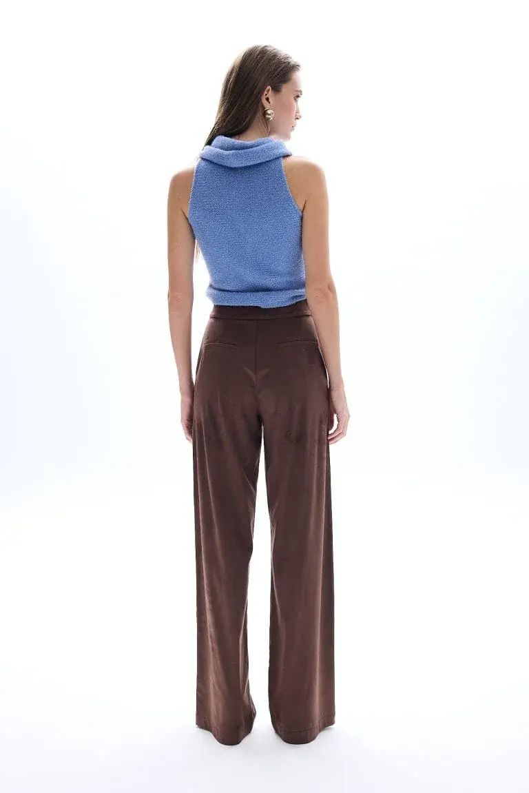 Crafted from a soft, suede-effect fabric, the Odette Suede Brown Pants blend comfort and sophistication. Designed with a high-rise waist and elegant wide-leg cut, they elongate the silhouette while offering effortless movement. The subtle stretch and matte texture enhance their luxurious feel, making them a versatile staple for both day and night. Pair them with the matching Odette Suede Brown Blazer for a refined statement look that embodies contemporary elegance.