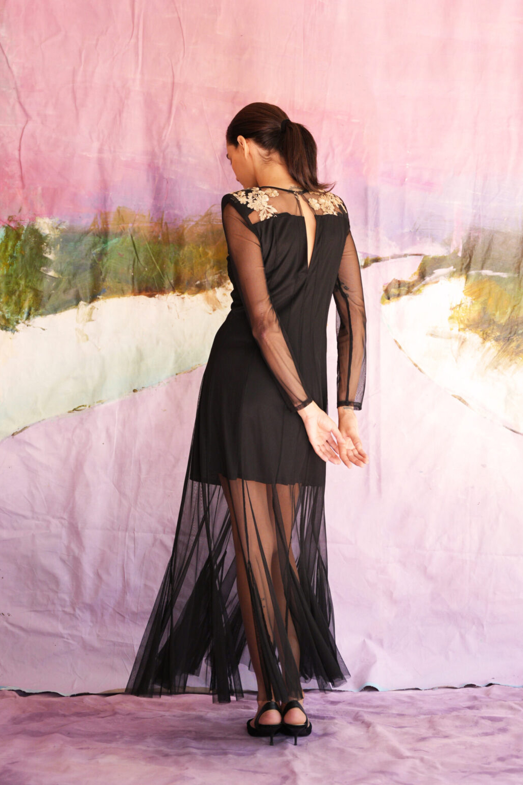 Μάξι φόρεμα από δαντέλα και παγιέτες στους ώμους.
