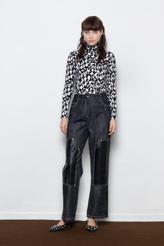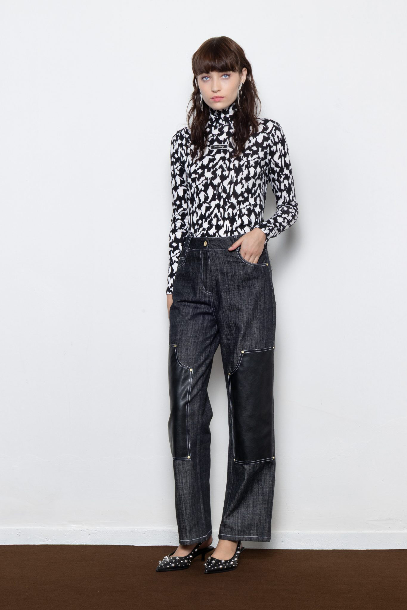 Second-skin statement. Fitted turtleneck top in abstract black and white print with long sleeves and a high neckline — bold, sculptural, and made for standout layering.