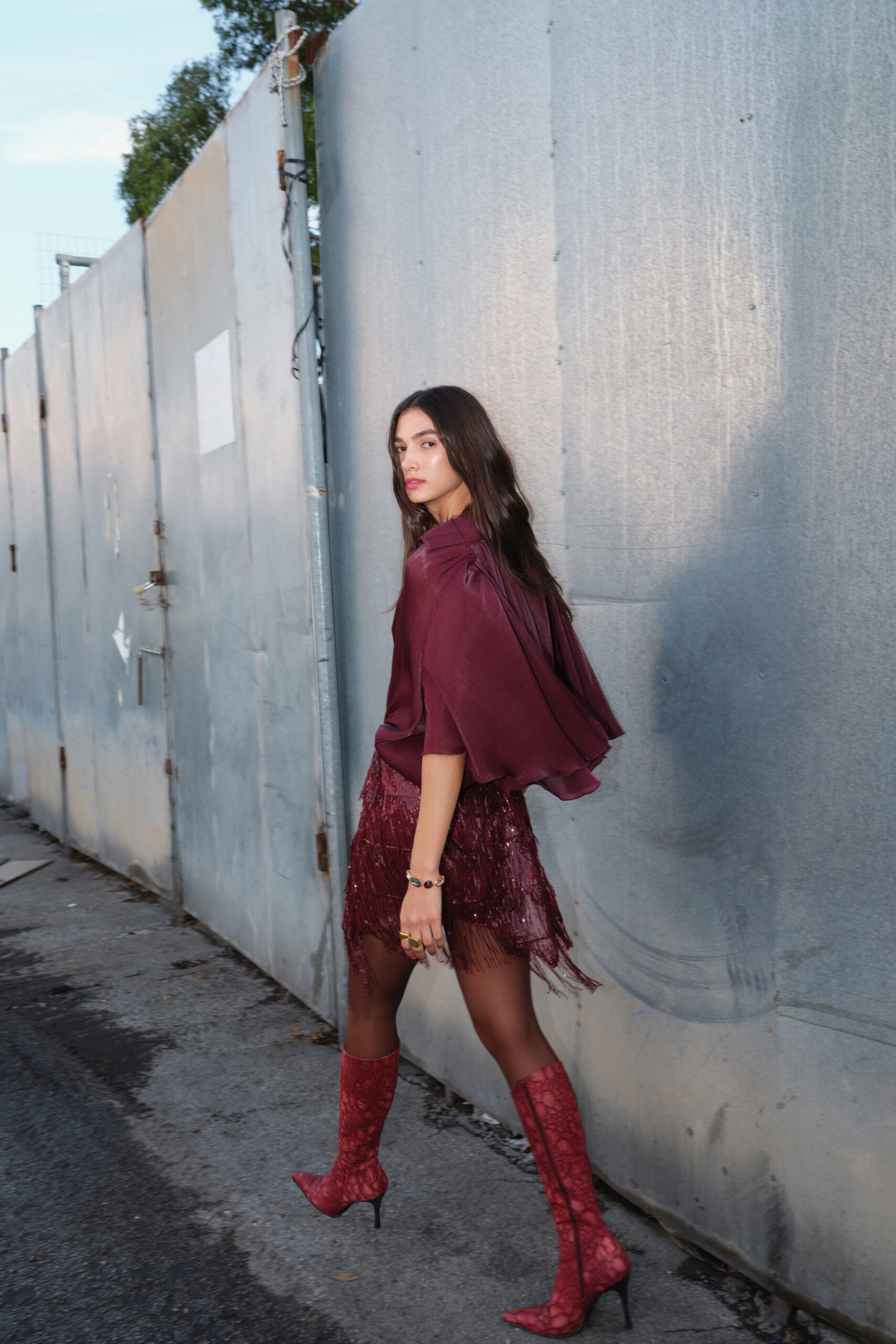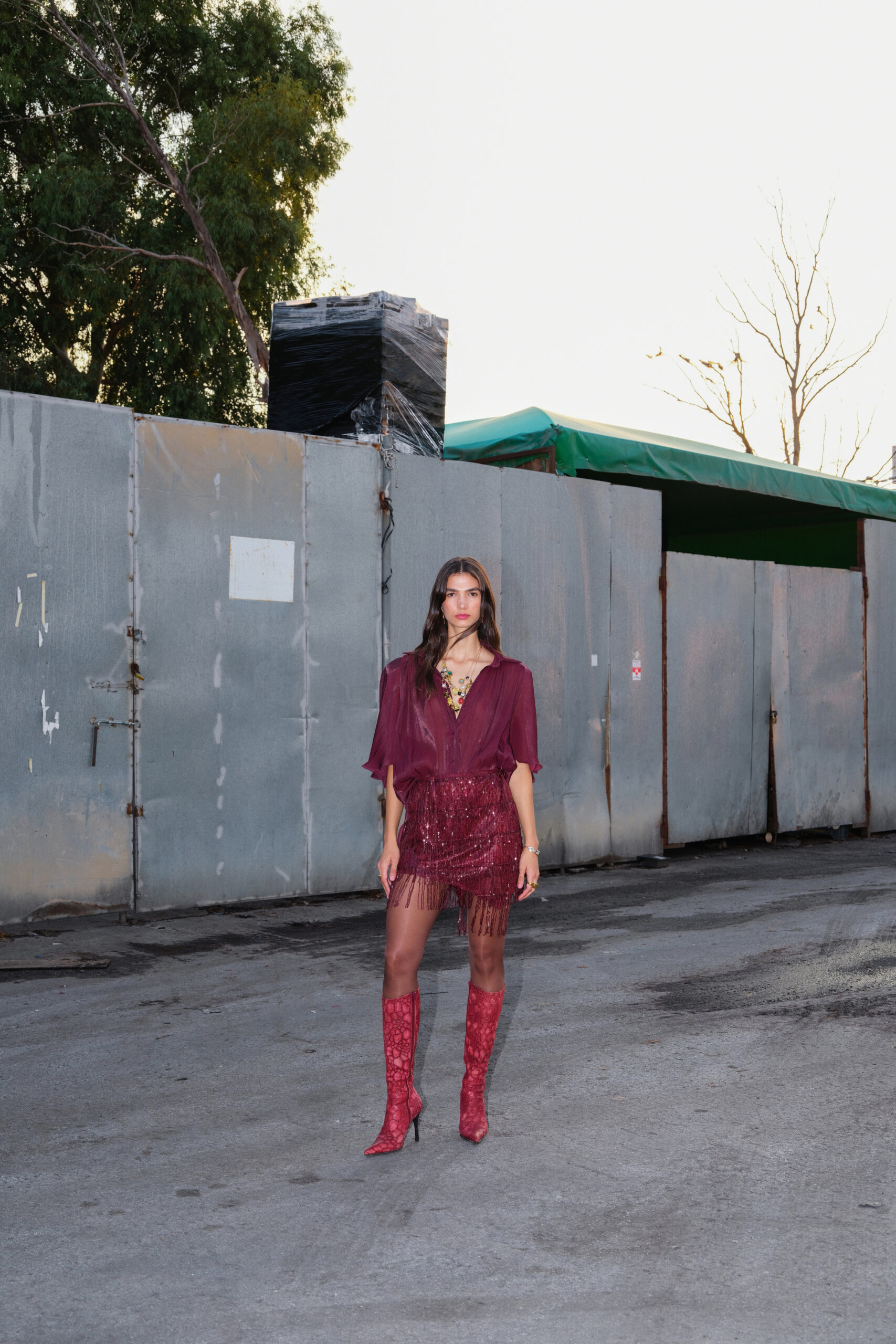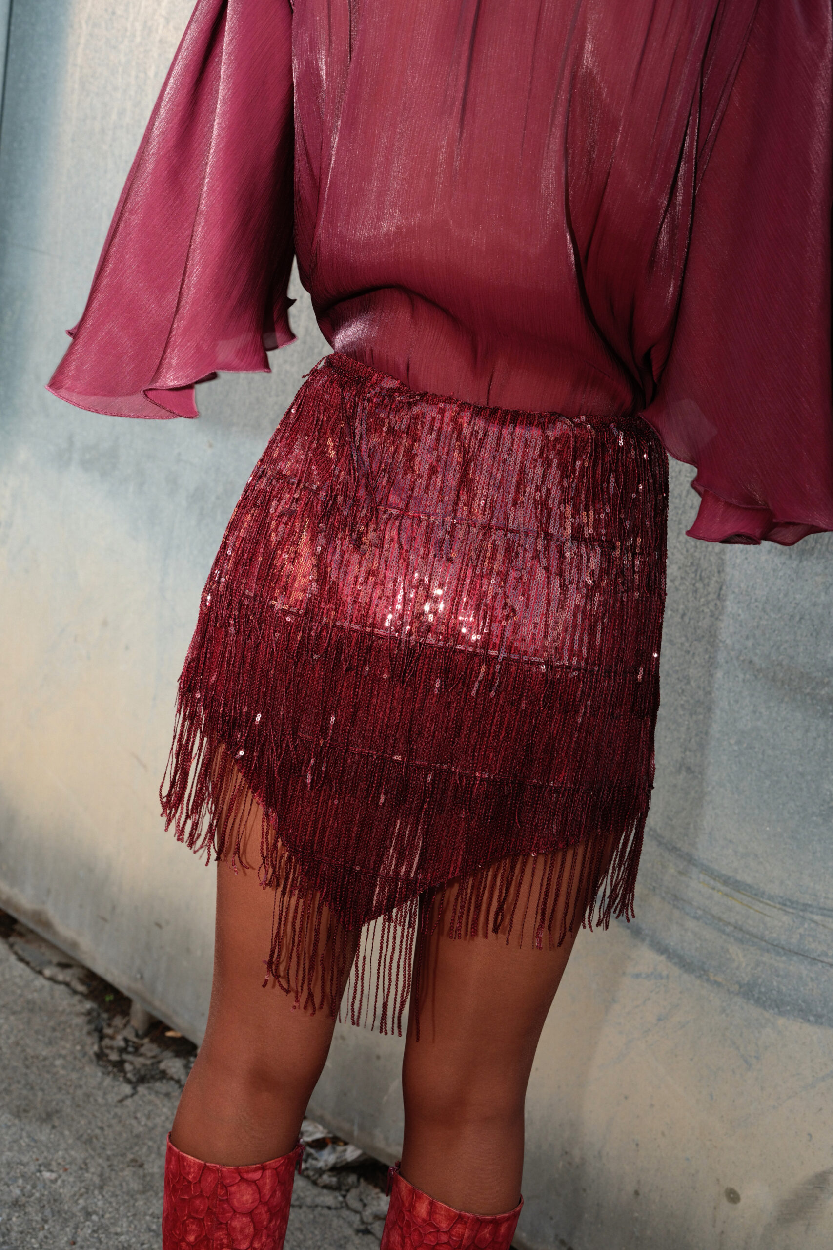Mini φούστα ασύμμετρη με παγιέτα κρυστάλλινη και λάστιχο στη μέση.