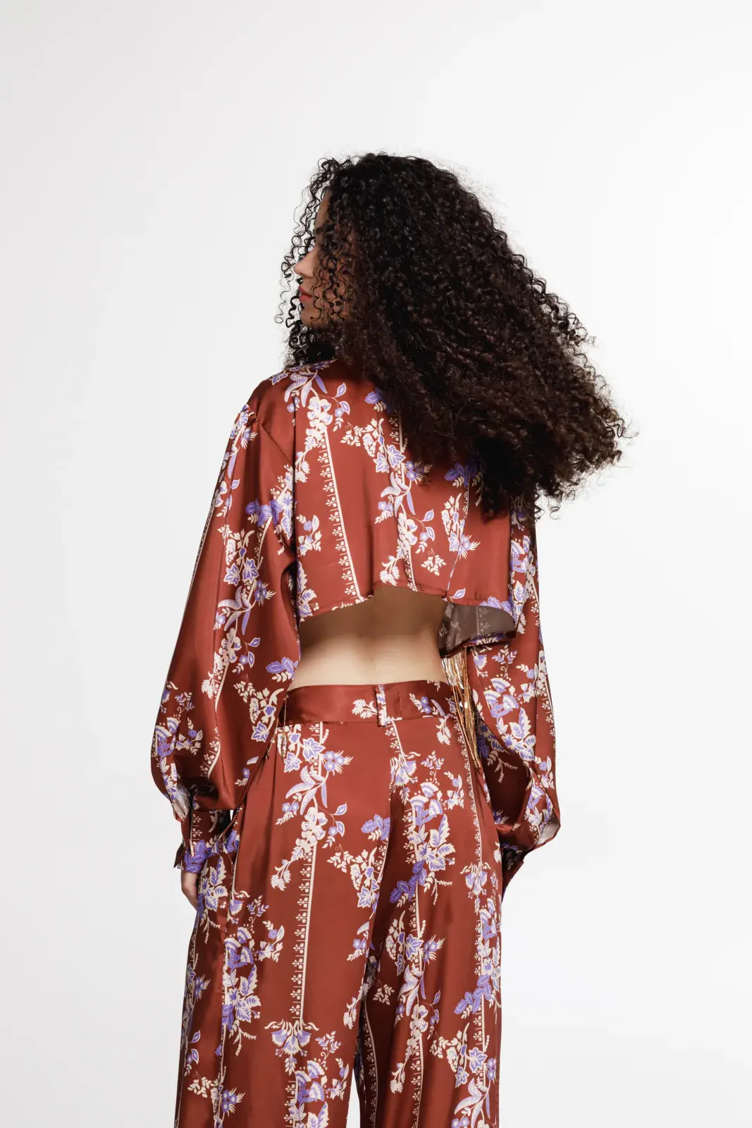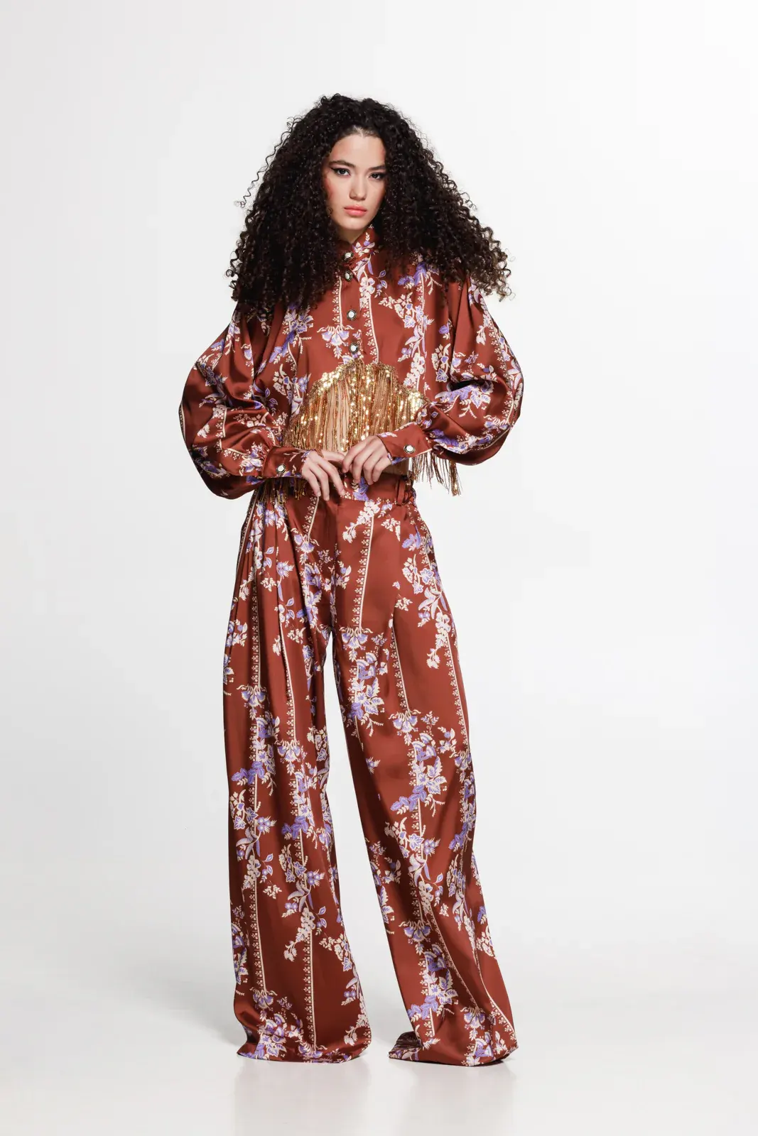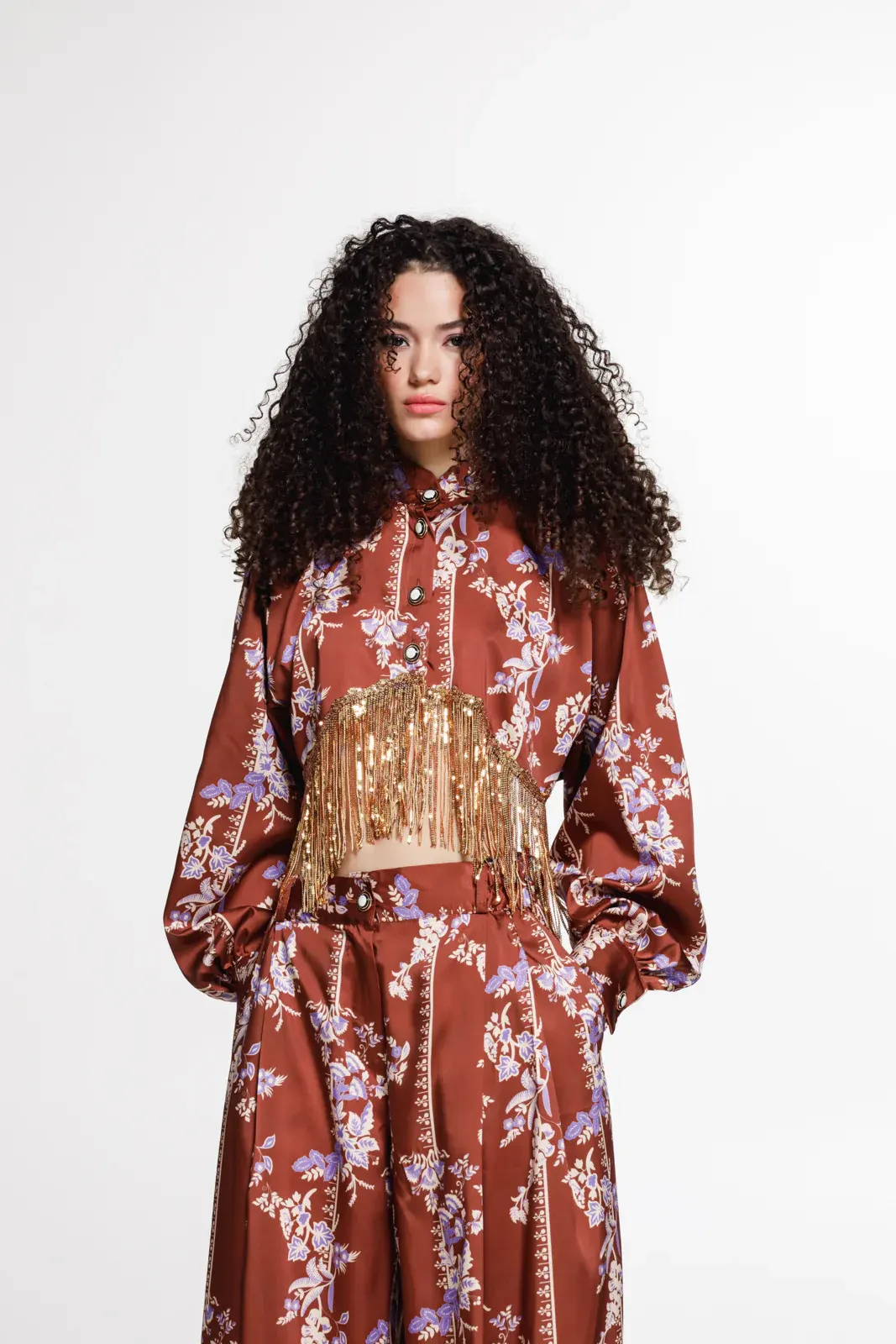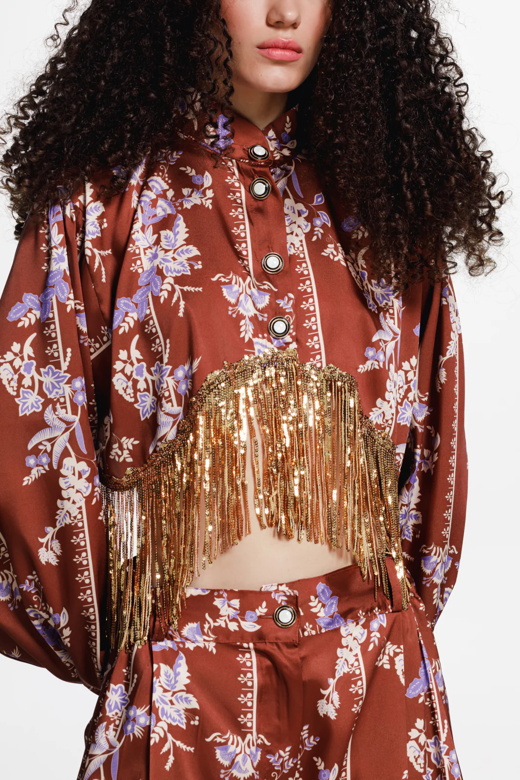 A statement cropped shirt in a floral print, designed to blend vintage elegance with bold contemporary detail. Crafted from a fluid fabric, it features voluminous sleeves, a high neckline with decorative buttons, and a dramatic curved cut-out at the waist highlighted by shimmering gold sequin fringes.