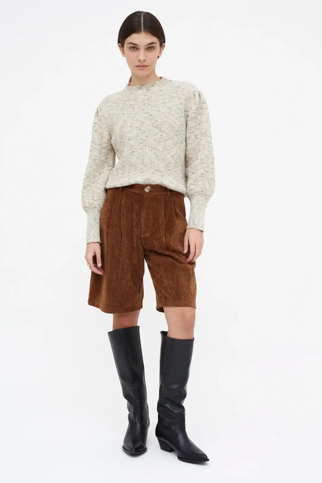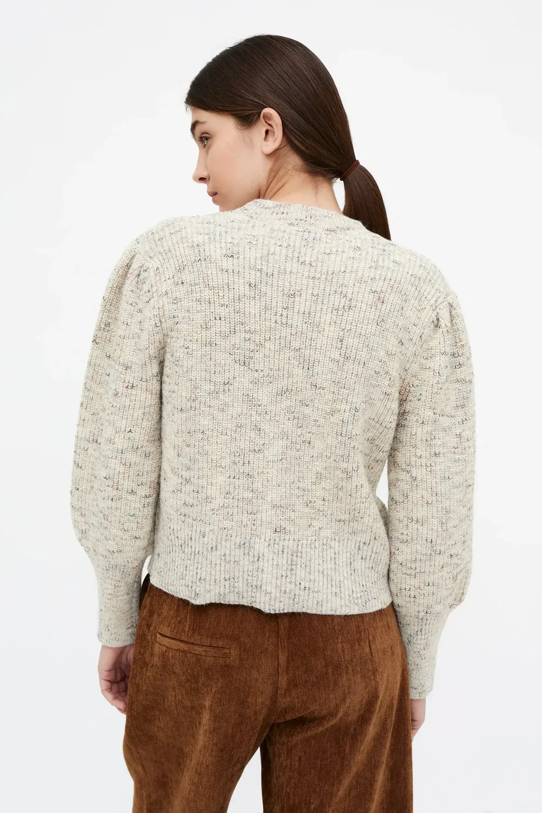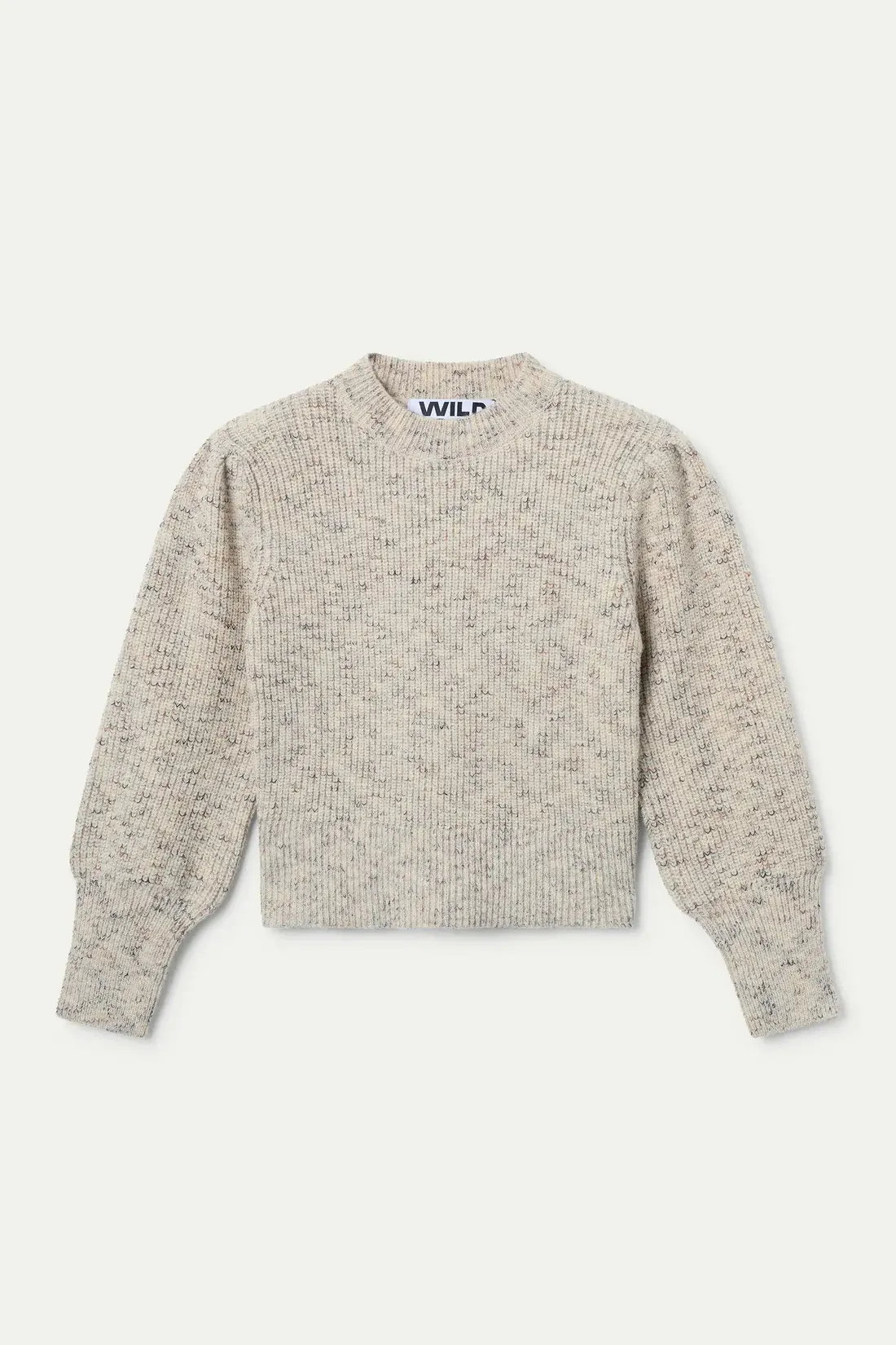 White knit sweater with a round neck and long sleeves. Gathered details on the sleeves.